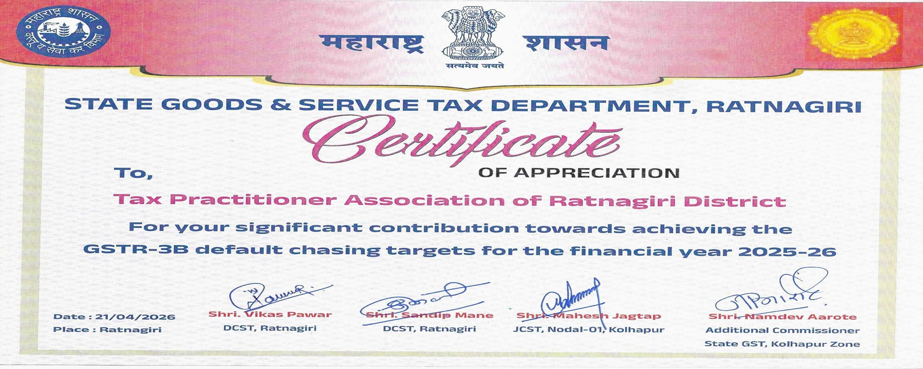 कर सल्लागार असोसिएशन रत्नागिरी जिल्हा , Also known as as "Tax Practitioner's Association of Ratnagiri District" (herein after called as TPAoRD) is a District-level body of Tax Practitioners established in year 2017. The association has its membership spread all over the district of Ratnagiri comprising of Tax Practitioners, Chartered Accountant, Advocates, Cost Accountants, Company Secretaries, etc. practicing in Income Tax, GST, VAT, Service Tax and allied laws.
